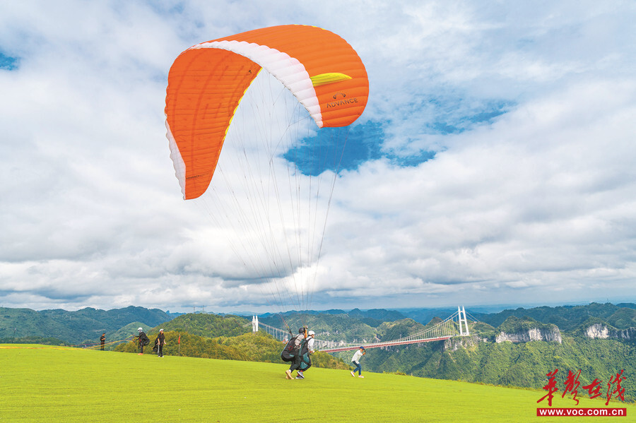 9月27日,吉首市矮寨風景名勝區滑翔營地,游客前來體驗空中俯瞰矮寨大橋和苗嶺大峽谷的獨特視角。為迎接國慶、中秋假期,景區升級營地設施,通過直播引流等方式吸引游客,帶動當地文旅消費熱潮。