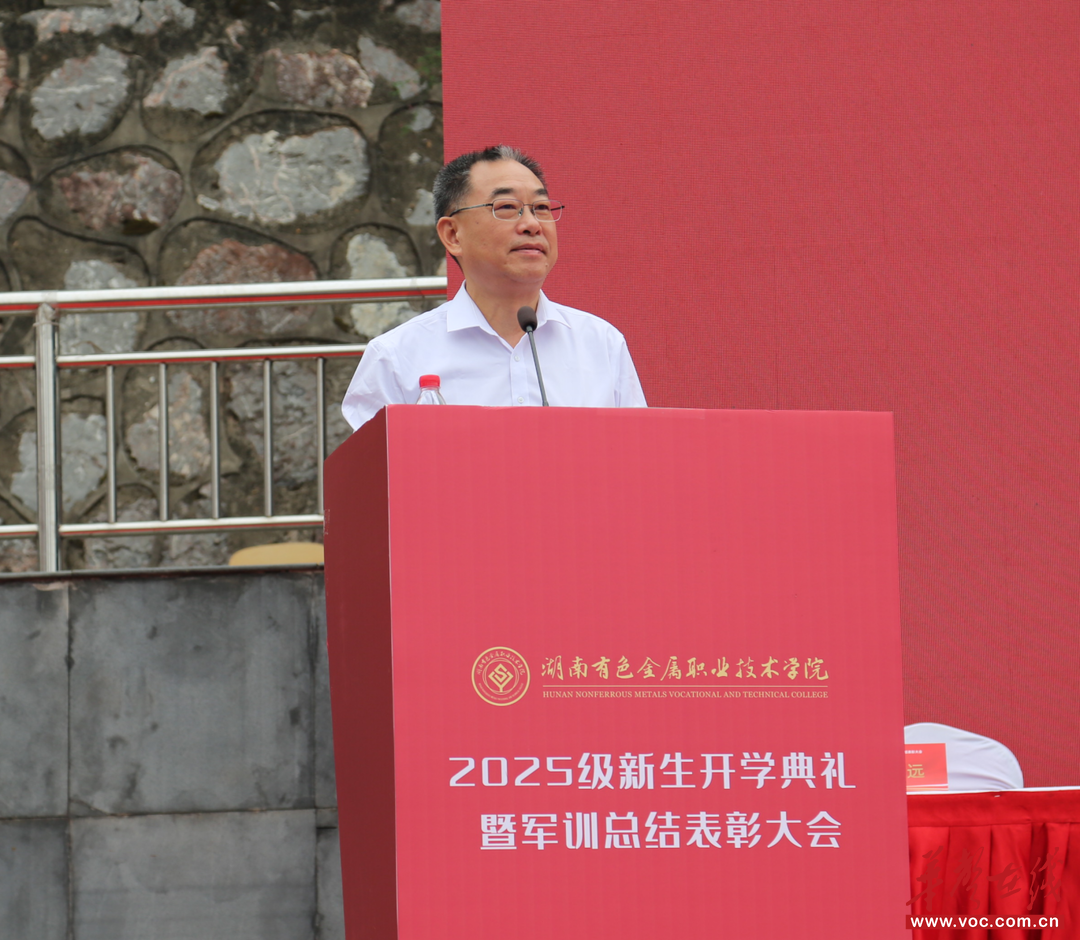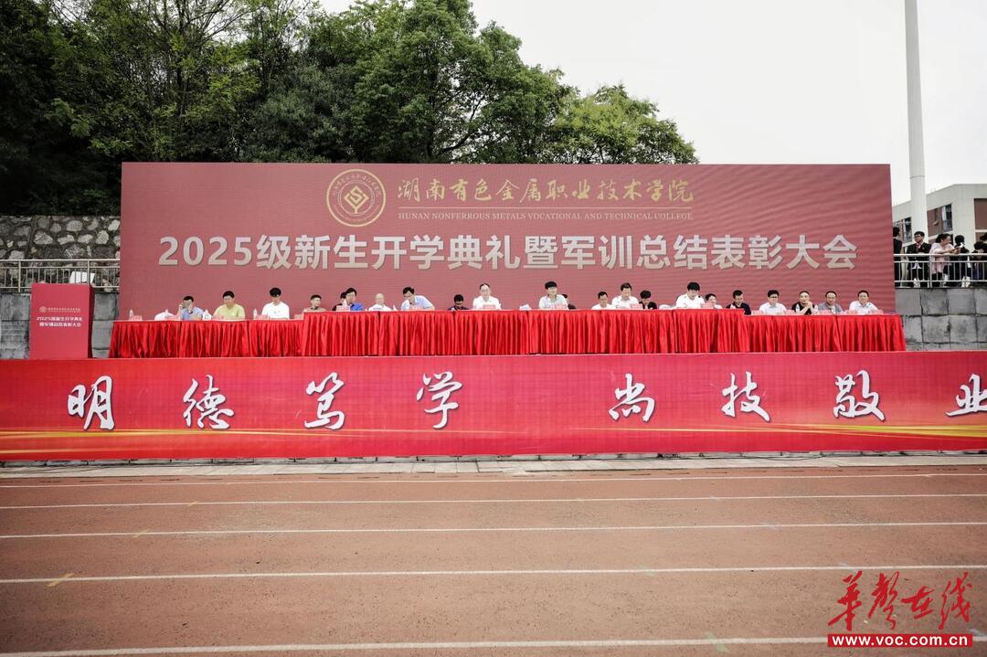 華聲在線9月30日訊(通訊員 晏茜)9月30日上午,湖南有色金屬職業技術學院在運動場舉行2025級新生開學典禮暨軍訓總結表彰大會,學院黨委書記許國強以“在青春磨礪中淬煉成鋼,于有色沃土上鑄就未來”為題,為全體3478名新生講授“開學第一課”。學院黨委副書記、院長譚驍彧,黨委副書記陳益林等黨政領導,相關職能部門負責人、各系學工領導、新生輔導員、軍訓教官與新生共同參會,典禮由學院黨委委員、副院長曾維平主持。