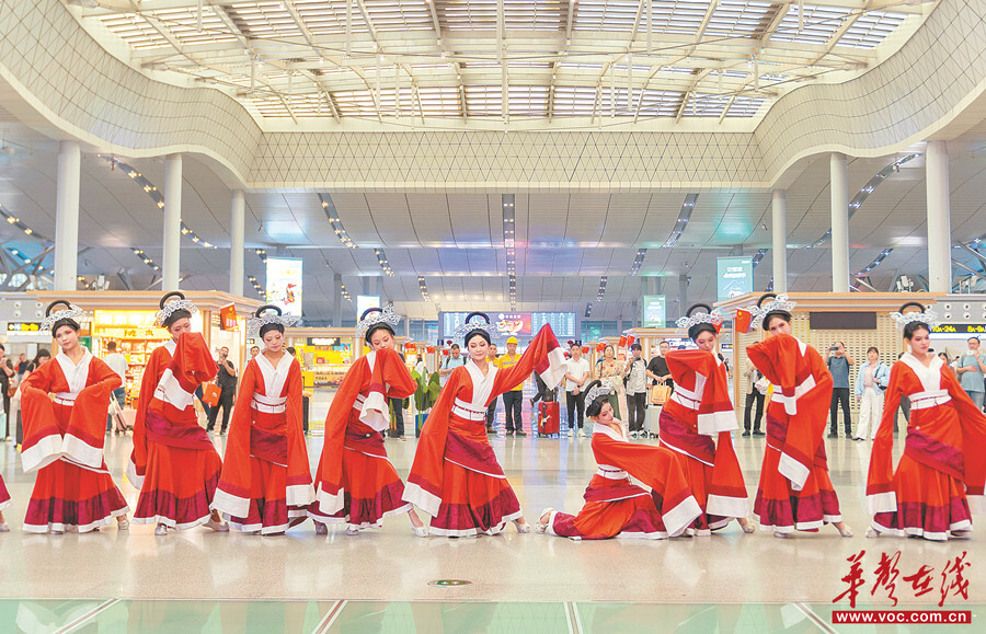10月1日,長沙高鐵南站,銅官窯國風樂園為旅客獻上“古風快閃”表演。