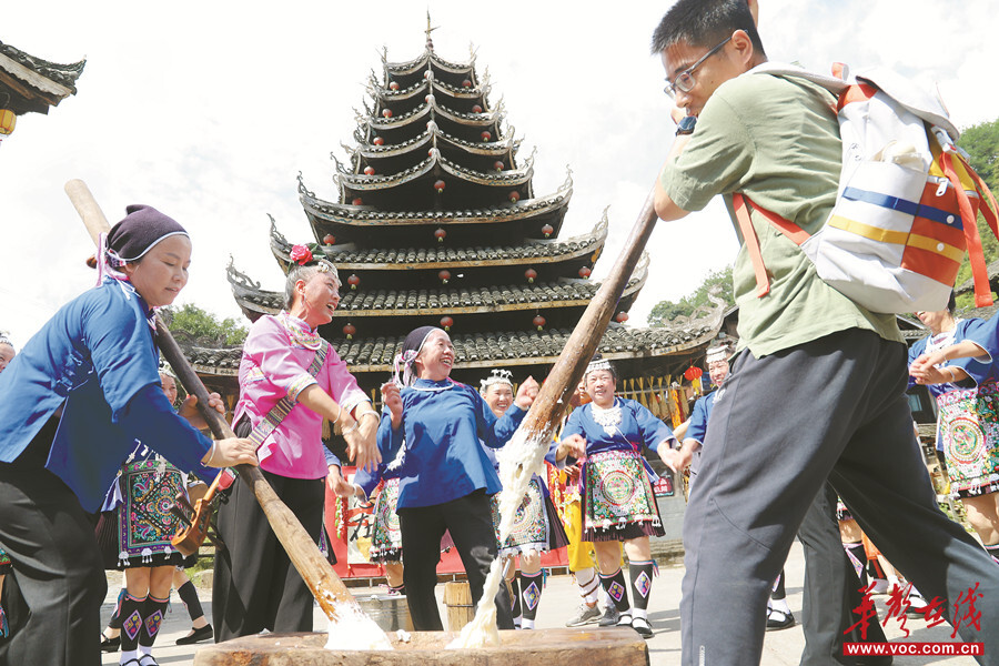 10月1日,通道侗族自治縣雙江鎮芋頭村,游客在體驗打糍粑。