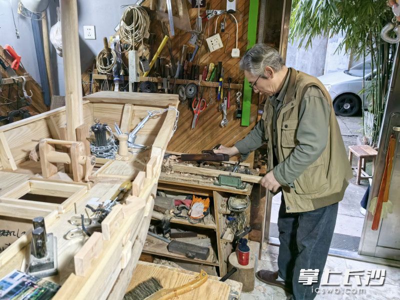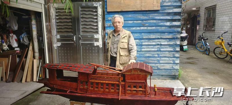 9月25日,在開福區(qū)芙蓉北路街道鳳亭社區(qū)網(wǎng)船班小區(qū)一間普通的工作室里,湖湘木帆船制作技藝長沙市級代表性傳承人、75歲的王芳德正俯身打磨著一艘木帆船的龍骨。這艘正在成型的船模,將承載著友人“重走海上絲綢之路”的心愿。門口靜立的輪船模型,無聲訴說著主人一生的牽掛。這位在湘江上漂泊了一輩子的老船長,如今最大的心愿是希望在有生之年用自己的雙手,復刻三四十艘木帆船,留住那些正悄然消逝的木帆船記憶。