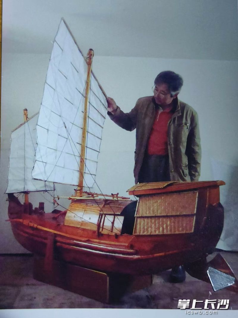 王芳德和他復原的第一艘木帆船。 長沙晚報全媒體記者 周小華 翻拍