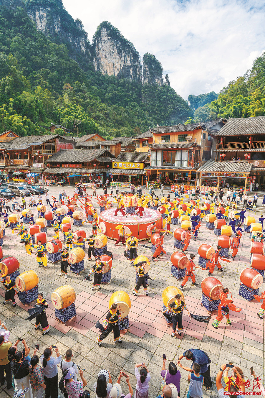 10月2日,吉首市矮寨鎮德夯苗寨景區,百余名身著苗族盛裝的鼓手同臺齊奏,開展“百鼓齊鳴慶國慶”主題活動,吸引眾多游客駐足觀賞、參與體驗。