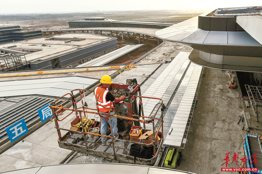 10月2日,長沙機場T3航站樓改擴建工程施工現場,中建五局不二幕墻公司工人在進行吊頂膠條安裝作業。湖南日報全媒體記者 辜鵬博 攝