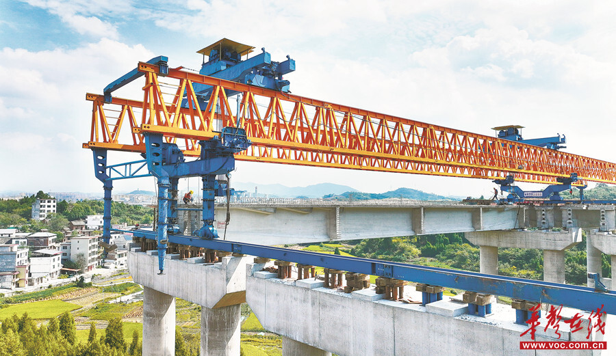 10月2日,新田縣龍泉街道石甑源村,桂(東)新(田)高速桂陽至新田(寧遠)段建設現場,工人在進行橋梁施工作業。
