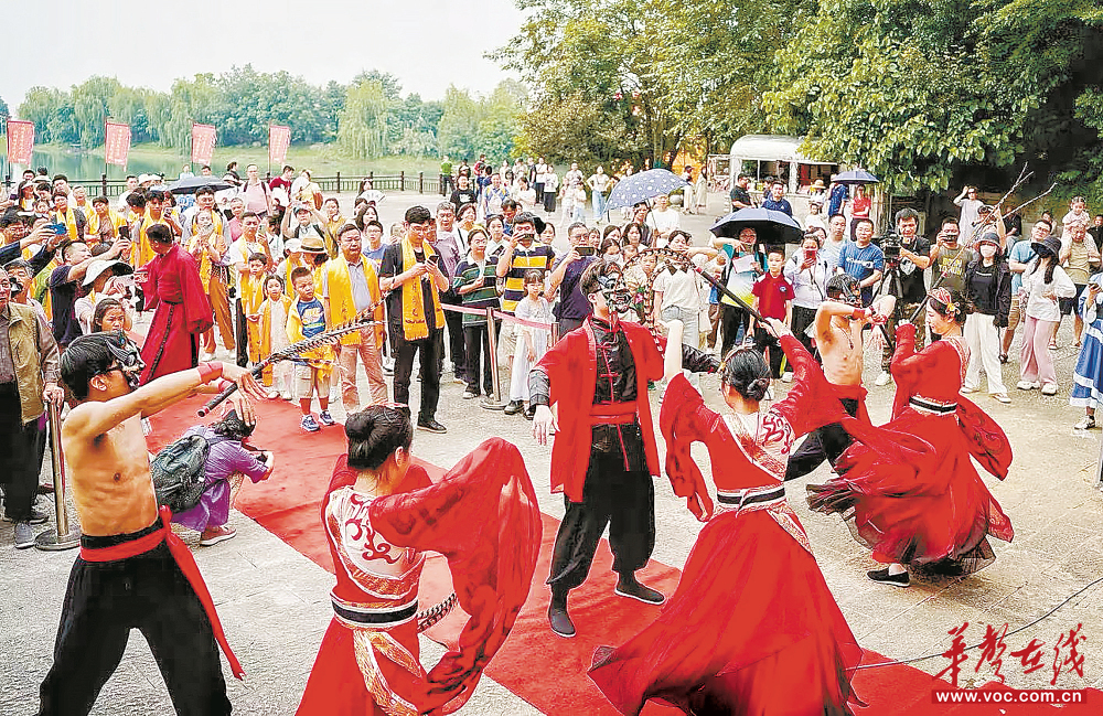 10月4日,游客在汨羅屈子文化園觀賞表演。國慶中秋期間,該園推出“大楚狂歡節”主題活動,游客通過觀看祭屈大典、非遺展演等,感受楚文化魅力。 周楊 攝(湖南圖片庫)