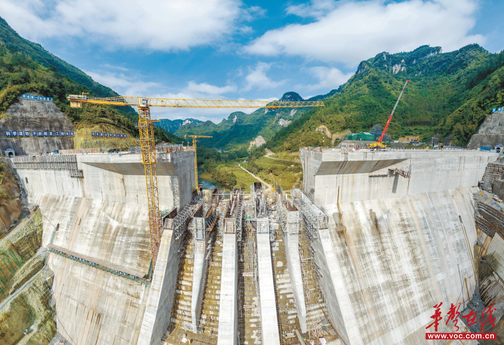 10月4日,吉首市矮寨鎮大興寨水庫工程建設現場,工人正在施工。國慶假期,建設者們放棄休假,堅守崗位,全力推進這一重點水利工程建設。
