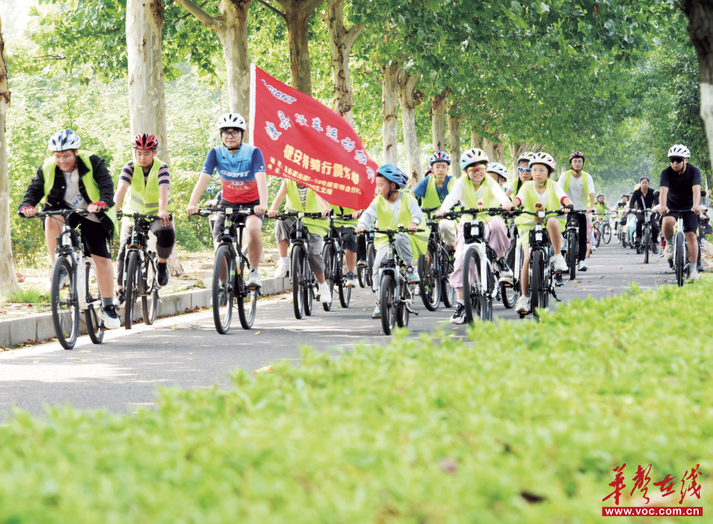 10月5日,澧縣澧浦街道黃沙灣社區屈原路,親子騎行隊伍正快樂行進。當天,澧縣捷安特騎行俱樂部組織6至12歲兒童及其家長開展親子騎行活動,以健康運動的方式共慶國慶中秋佳節。柏依樸 攝(湖南圖片庫)
