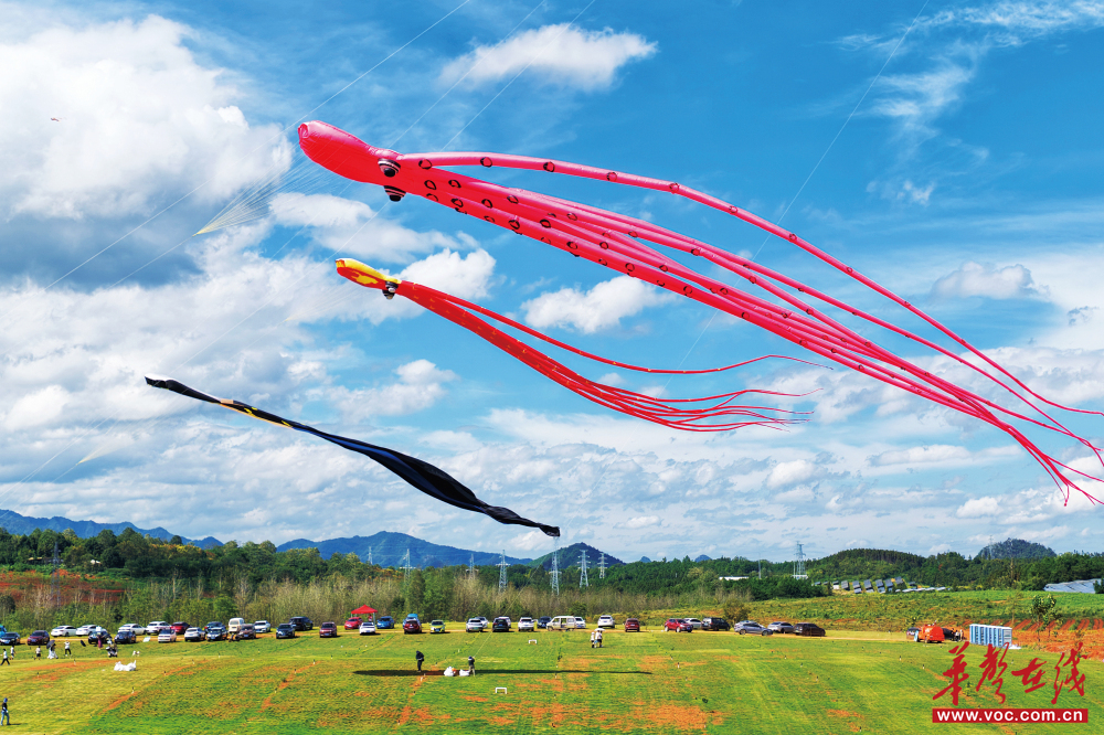 10月6日,藍(lán)山縣首屆大型風(fēng)箏節(jié)在楠市鎮(zhèn)千畝草坪舉行,專業(yè)團(tuán)隊(duì)與風(fēng)箏愛好者一起放飛各式風(fēng)箏。黃春濤 攝(湖南圖片庫)