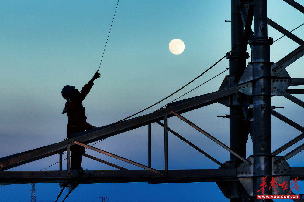10月6日,衡陽市雁峰區(qū)南三環(huán)路上,正在高塔上進(jìn)行架線施工的湖南雁能建設(shè)集團(tuán)有限公司工作人員與初升的中秋月圓不期而遇。曹正平 攝(湖南圖片庫)