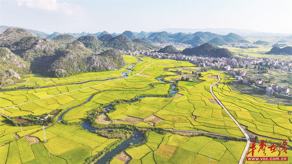 10月10日,新田縣石羊鎮南國武當山下萬畝富硒水稻基地,廣袤田野里水稻次第成熟,與河流、村莊、公路等交相輝映,繪就一幅美麗的田園豐收畫卷。