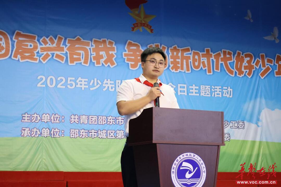 共青團邵東市委副書記趙文攀在儀式上發表殷切寄語。他首先向新隊員們表示熱烈祝賀,高度肯定了城區二小在少先隊工作中取得的優異成績。同時,他對全體隊員提出期望:希望大家牢記少先隊歷史,樹立遠大理想,錘煉高尚品德,爭做志存高遠、品德高尚、不負時代的新時代好少年,用實際行動踐行錚錚誓言,在“愛我邵東,共建邵東”的生動實踐中,展現新時代少先隊員的最美風采。