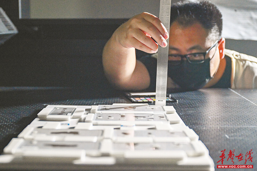 9月11日,湖南省博物館文物攝影室,工作人員對長沙子彈庫戰國帛書殘片進行高清掃描。