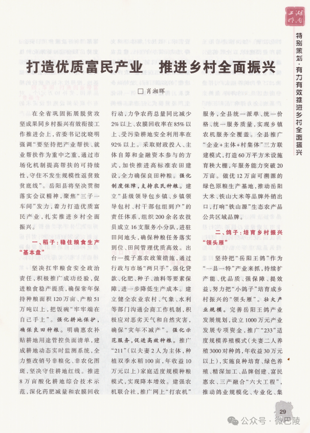 《湖南工作》2025年第9期刊發岳陽縣委書記肖湘暉署名文章《打造優質富民產業 推進鄉村全面振興》,對岳陽縣農業產業進行了全面的總結和推介。: