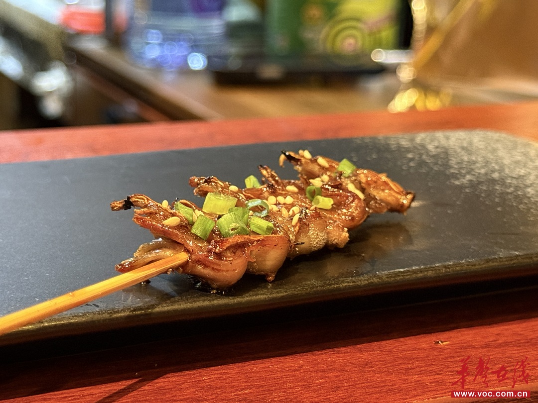 京蔥雞腿肉是小唐每次“必點曲目”,蔥香和肉香完美融合,切成一段段白白圓圓的大蔥,散發著迷人香氣,讓小唐無法抗拒,雞腿肉嫩到飆汁,沾點辣椒面,簡直絕殺。紫蘇雞皮黑虎蝦把小唐愛吃的三樣全都囊括,焦香酥脆的雞皮,配上飽滿q彈的蝦肉,加上點綴的紫蘇絲,不禁想大呼:好味!安利是一個隱藏必點:橫膈膜,肉質細膩、脂味均衡,咀嚼口感極佳,還帶著一種野性香氣,不知道是不是源于內臟的獨特風味,小唐只能說,但凡嘗過絕對會成為你的燒鳥必點,比雞脆骨好吃太多。最后用一塊海苔烤年糕收尾,那吹著晚風的少時回憶,就那么涌上了心頭。