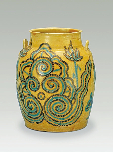 揚州博物館藏長沙窯青釉褐綠點彩云荷紋雙耳罐,1974年揚州唐城遺址出土。 資料圖