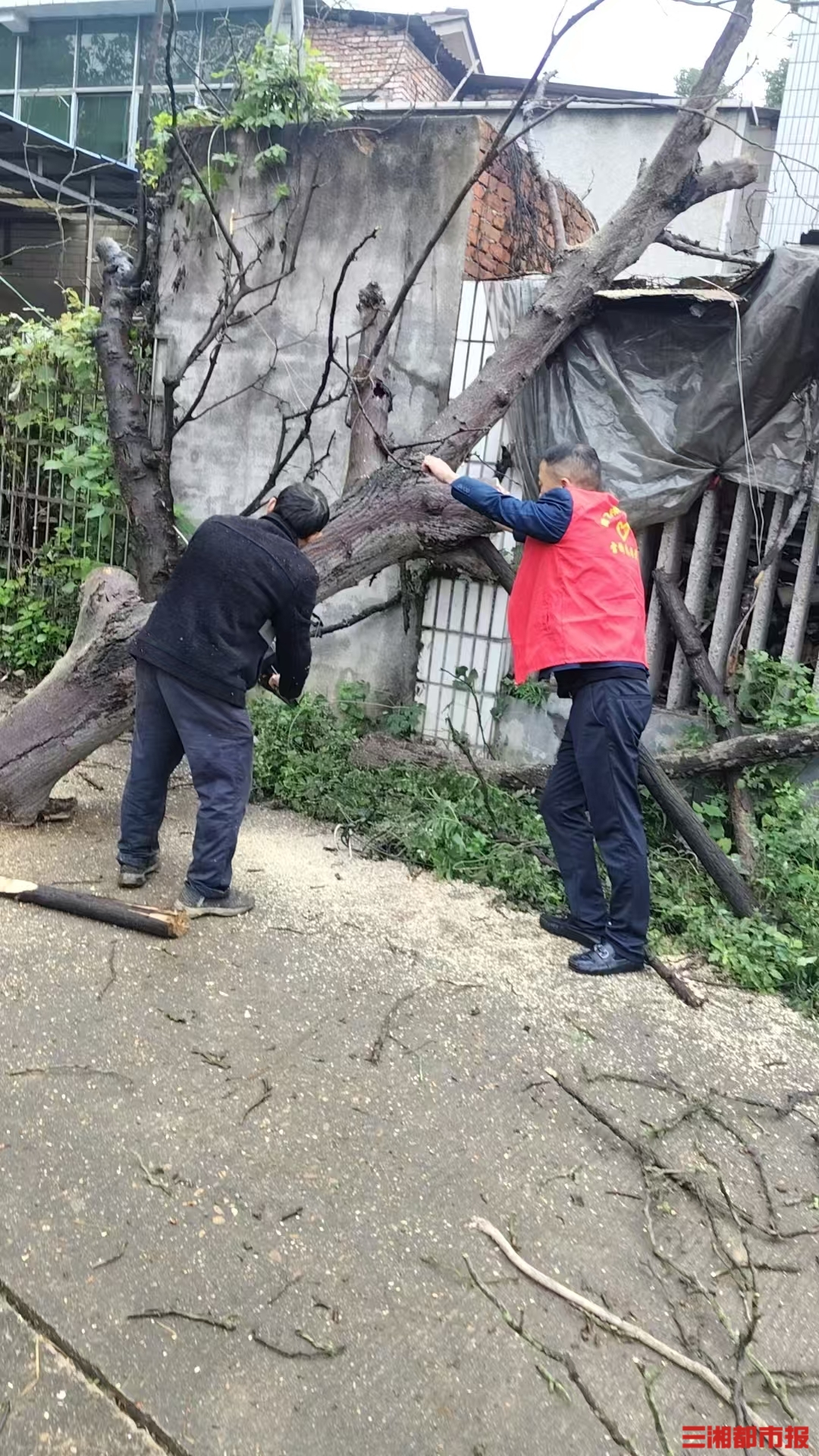 從現場畫面來看,倒伏的大樹樹干抵著房屋山墻,搖搖欲墜。在協調供電部門緊急斷電后,工作人員立即分工協作,利用油鋸、繩索等工具對倒樹進行分段切割清理。經過4小時緊張作業,倒樹被徹底移除,受損電線完成臨時固定,道路恢復通行。