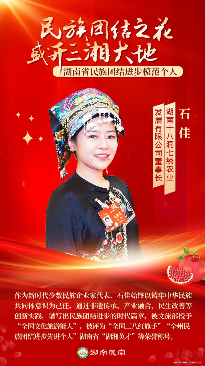 石佳,全國人大代表,湘西七繡坊苗服飾文化有限責任公司、湖南十八洞七繡農業發展有限公司創始人。作為少數民族企業家,她通過非遺傳承、產業融合等創新實踐,譜寫民族團結進步的時代篇章,獲“全國文化旅游能人”“全國三八紅旗手”“全州民族團結進步先進個人”等榮譽。2025年9月,中共湖南省委、湖南省人民政府授予石佳“湖南省民族團結進步模范個人”稱號。