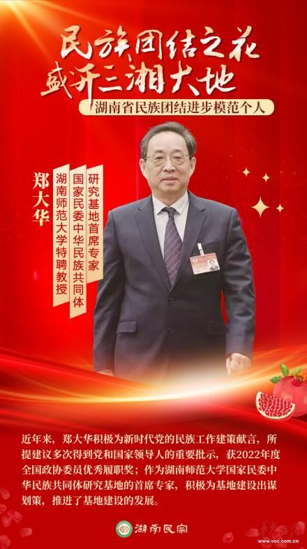 鄭大華,土家族,湖南師范大學國家民委中華民族共同體研究基地首席專家,第十三屆全國政協委員,中央統戰部黨外知識分子建言獻策專家組專家,中華民族團結進步協會專家工作委員會主任,湖南省民族研究學會會長。他積極為黨的民族工作建言獻策,得到黨和國家領導人重要批示。他研究中國近代中華民族復興思想、中華民族的自覺轉型、中國共產黨的民族理論和政策等重大理論問題,成果豐碩。2025年9月,湖南省委、省政府授予鄭大華“湖南省民族團結進步模范個人”稱號。