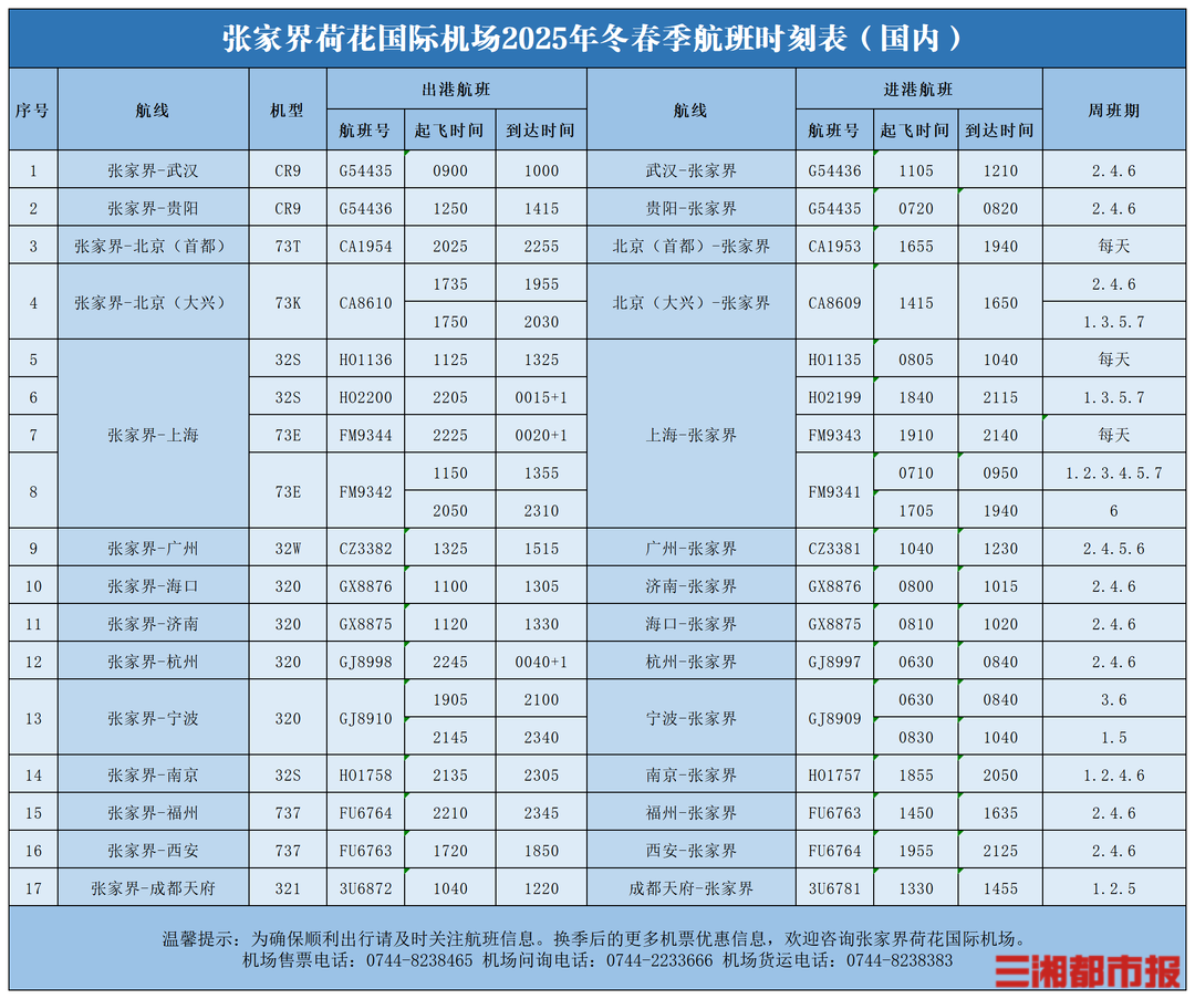 華聲在線10月23日訊(全媒體記者 李致遠 通訊員 劉思涵)10月23日,記者從張家界荷花國際機場(下稱:張家界機場)獲悉,今年10月26日至2026年3月28日,張家界機場將執行冬春航季航班計劃。新航季周客運航班量258架次,計劃執行航線21條,通達國內外24個城市。較去年同期新增并加密多條航線,進一步提升航線網絡覆蓋能力和運行效率。