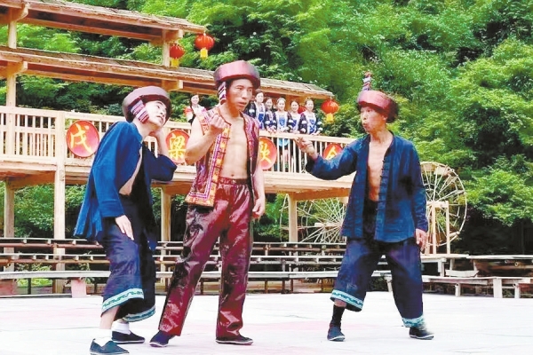 侗戲大約產生于清嘉慶至道光年間,最早起源于貴州、廣西與湖南三省交界之地的侗寨山村。通道侗戲于2008年入選為第二批國家級非物質文化遺產代表性項目。目前,通道與貴州的黎平、廣西的三江共為傳統侗戲非遺保護基地,而皇都侗文化村,便是通道侗戲的起源地與傳承地。傳統的侗戲表演形式簡化單一。演員在臺前每唱一句,伴以鼓樂之聲,然后走個8字形繞到舞臺后方,經躲在戲臺后邊桌下的“掌本”戲師口授一句歌詞之后,再繞到臺前演唱第二句,如此循環往復。演出簡單,全憑歌詞唱腔吸引觀眾。侗戲雖然原始粗糙,但“喜怒哀樂盡藏”,是大山里侗民的精神大餐。