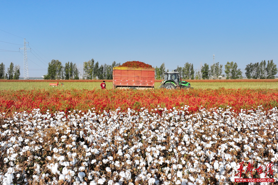 10月9日,新疆塔城地區沙灣市,貨箱內滿載收獲的辣椒。這抹熱烈的紅色,與雪白的棉花共同構成豐收的畫卷。