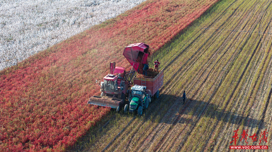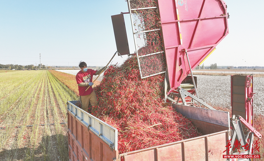 新疆塔城地區沙灣市,機器采收一畝辣椒只需要五六分鐘,每畝比人工采收節省了約1000元成本。