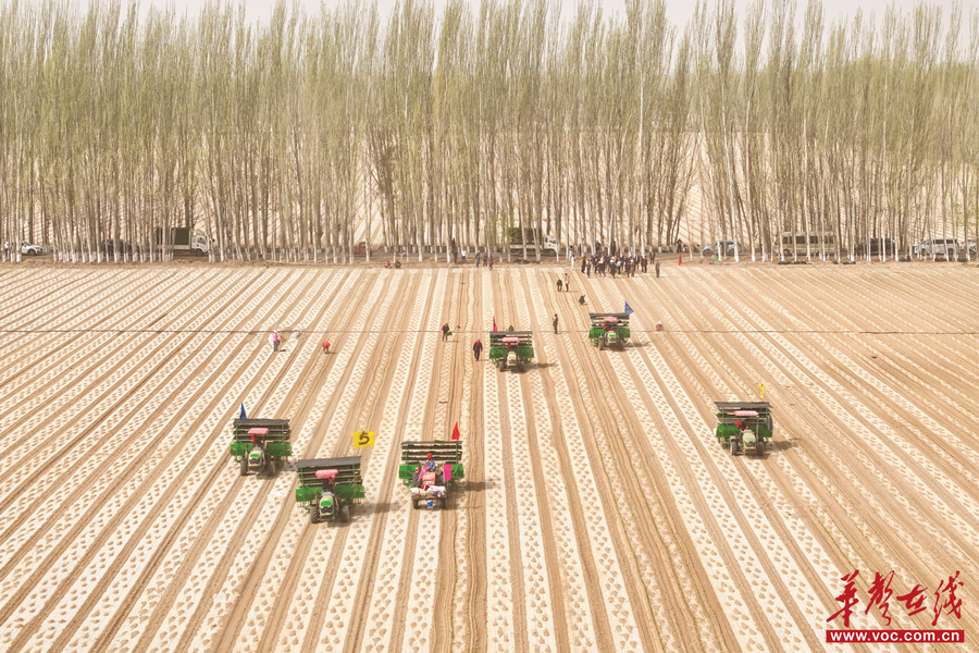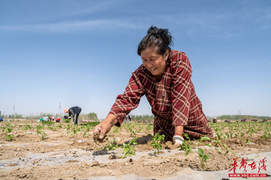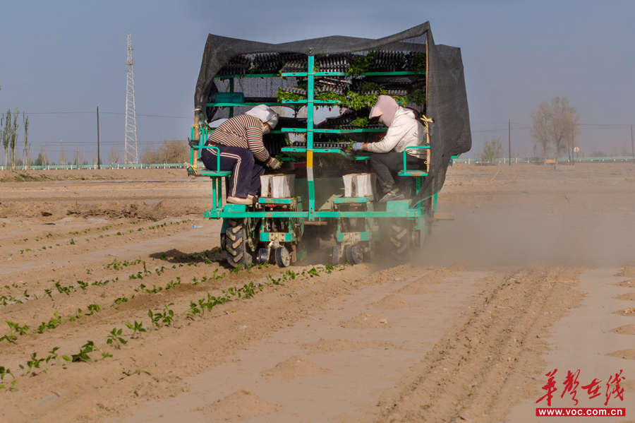 4月10日,新疆圖木舒克市四十四團永安鎮三連, 農戶搶抓農時,將培育好的辣椒苗移栽到田地里,為今年辣椒豐收起好步、開好頭。