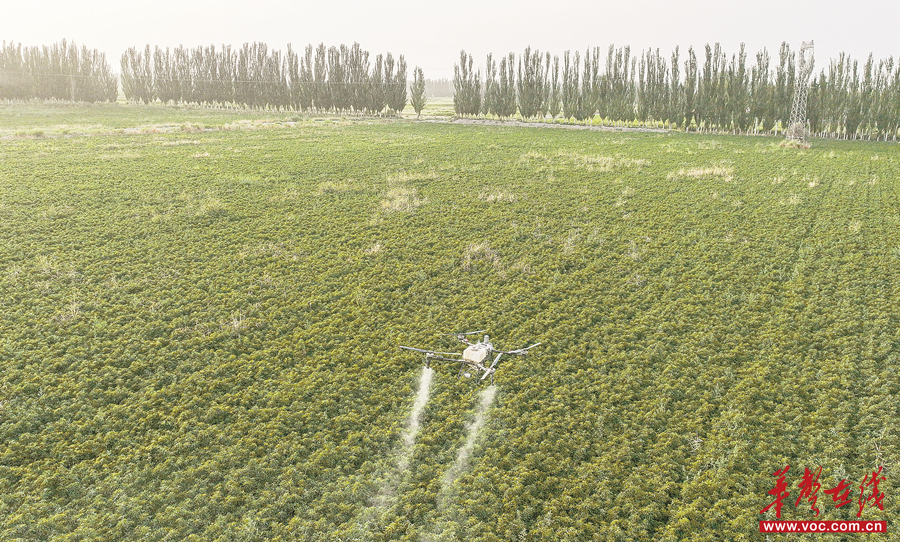 7月29日,新疆巴音郭楞蒙古自治州,植保無人機在空中穿梭盤旋,給辣椒施肥。