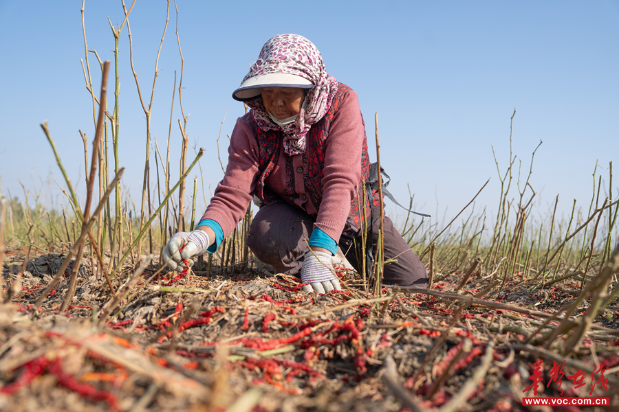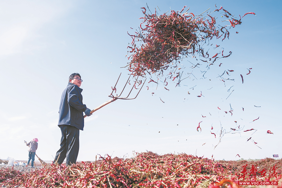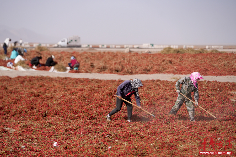 10月8日,新疆塔城地區沙灣市安集海鎮,椒農們穿梭在“紅海”中,忙著撿拾辣椒把。