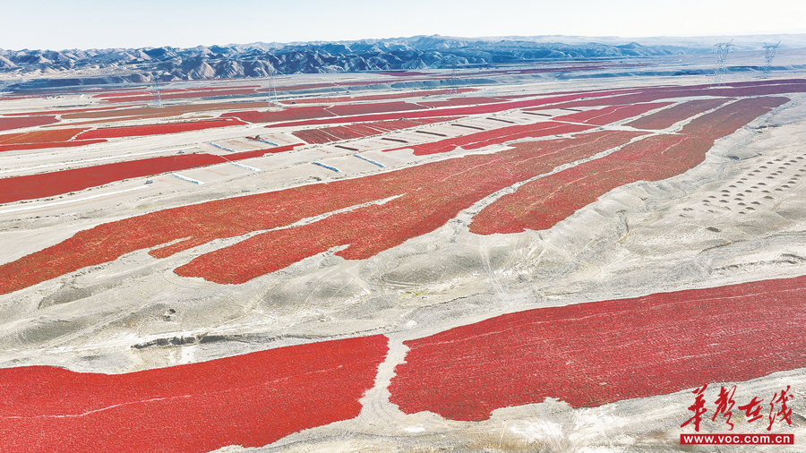 10月的天山北麓,戈壁灘上鋪展出令人震撼的“紅色海洋”——成片的辣椒在秋陽下晾曬,空氣中彌漫著香辣氣息。
