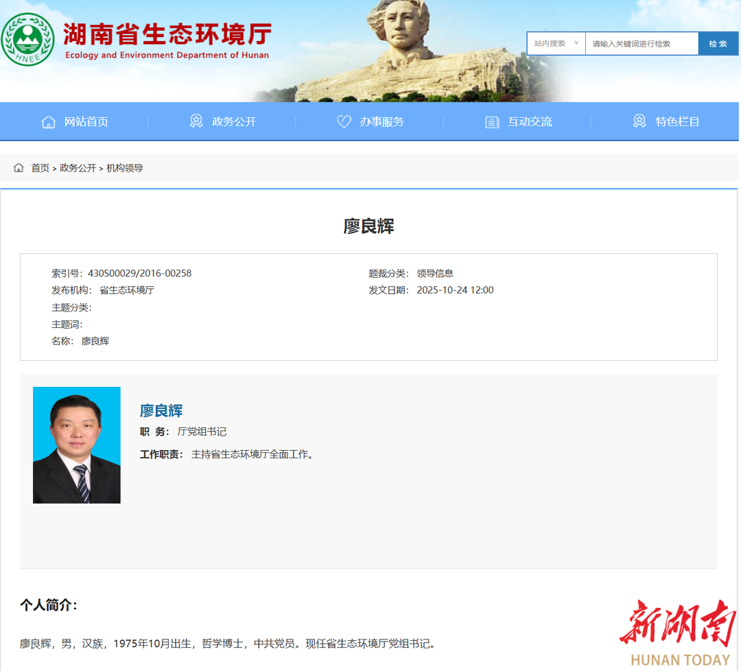 據(jù)湖南省生態(tài)環(huán)境廳官網(wǎng)“機構(gòu)領(lǐng)導(dǎo)”一欄顯示,廖良輝已任湖南省生態(tài)環(huán)境廳黨組書記。