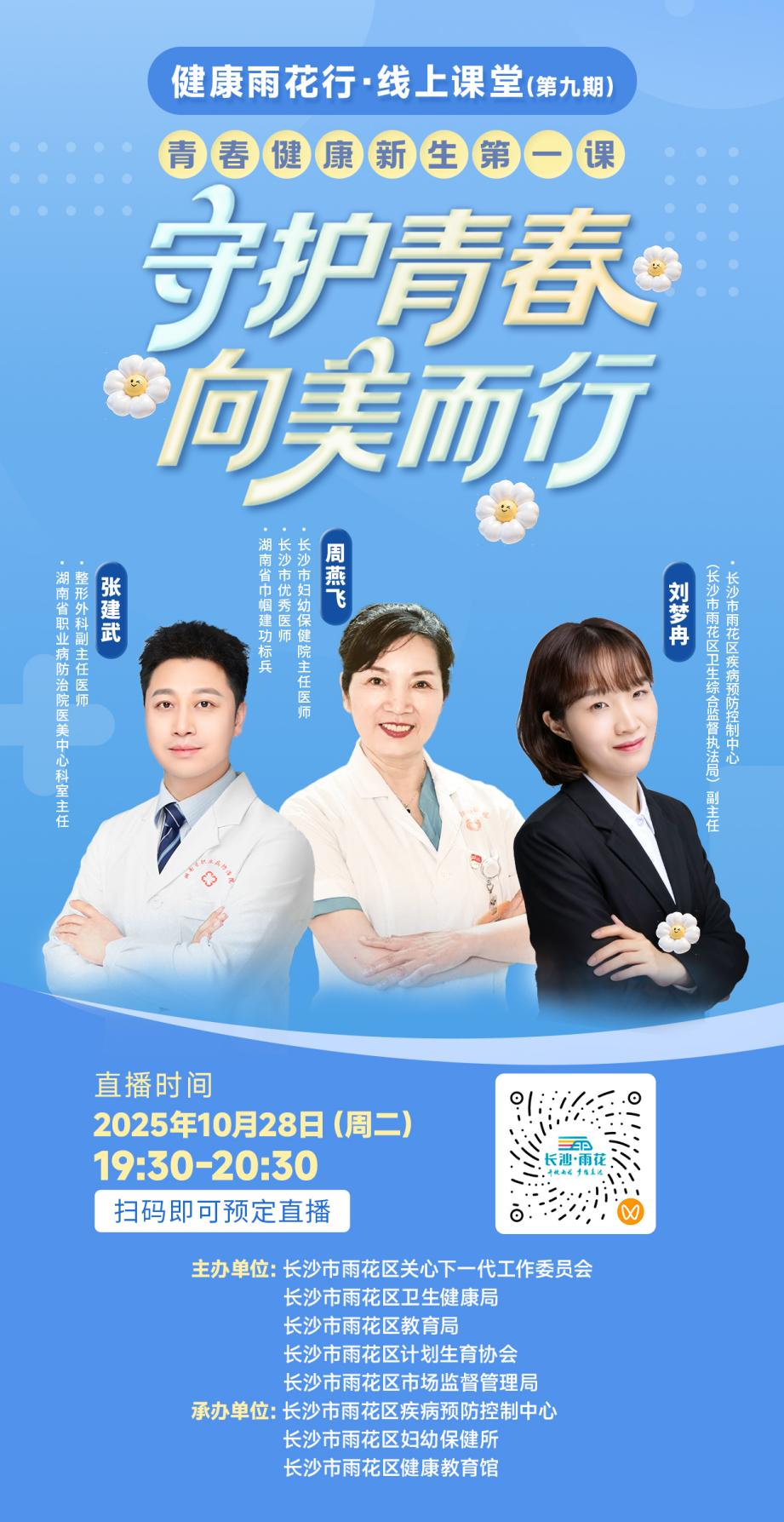 華聲在線10月27日訊(記者 張曼雪 通訊員 胡蓉)青春是人生中最絢爛的篇章,健康則是這篇章最堅實的底色。10月28日(星期二)19點30分,由長沙市雨花區關心下一代工作委員會、區衛生健康局、區教育局、區計劃生育協會、區市場監督管理局等聯合主辦的“健康雨花行·線上課堂(第九期)——‘青春健康新生第一課’”科普直播活動,將在“飛夢雨花”視頻號正式開播。