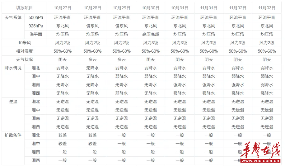 10月30日,陰天間多云有小到中雨,全省大部有明顯降水,考慮有污染傳輸風險,夜間在濕清除作用下快速好轉;空氣質量預計湘中、湘北良至輕度污染為主,湘南良,湘西優至良。
