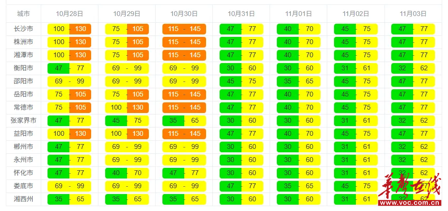 華聲在線10月28日訊(全媒體記者 趙瞳銥 實習生 李彥冰)記者今天從省生態環境監測中心獲悉本周(10月28日至11月3日)全省空氣質量預報。10月28日至30日,湘中、湘北地區有輕度污染風險;10月31日至11月3日全省大部有明顯降水,擴散條件較好,空氣質量優至良。