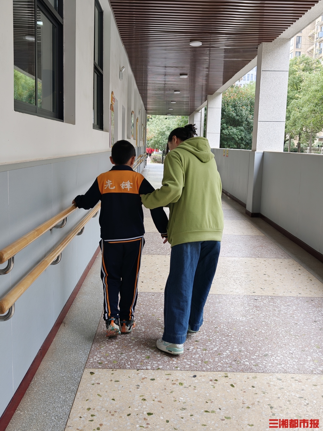 在長沙市天心區(qū)先鋒小學(xué)里,特需學(xué)生在老師的指導(dǎo)下堅持康復(fù)訓(xùn)練。(受訪者供圖)
