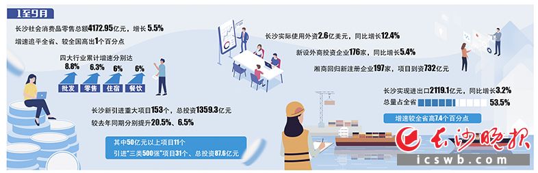 這些促消費“組合拳”,有效釋放了市場消費潛力。數據顯示,今年1至9月,長沙社會消費品零售總額增長5.5%,增速追平全省、較全國高出1個百分點;批發、零售、住宿、餐飲四大行業累計增速分別達8.8%、6.3%、6%、6%。消費市場整體呈現穩健向好態勢。