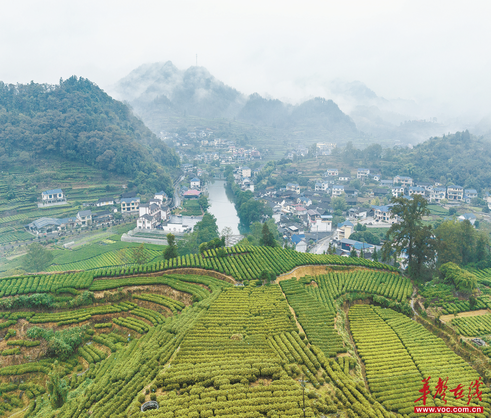 10月30日,吉首市馬頸坳鎮隘口村秋雨蒙蒙,茶園、村莊、河流與青山在雨霧中交織出一幅詩意盎然的生態畫卷。