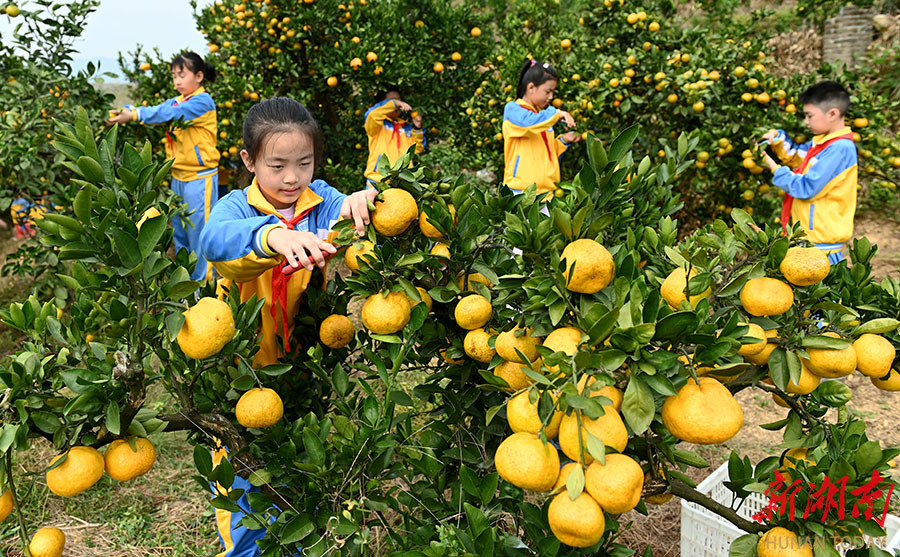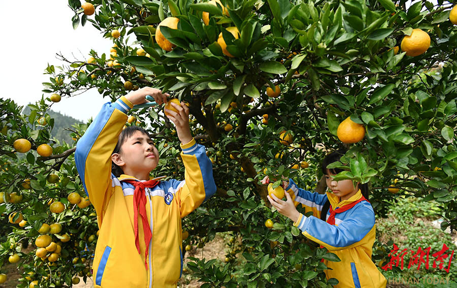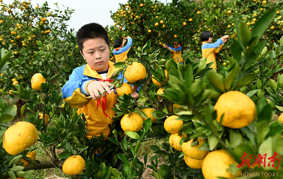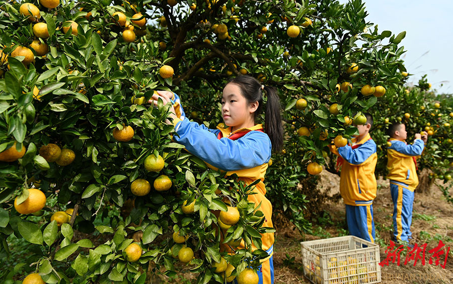 10月30日,洞口縣文昌街道第一小學學生在采摘柑橘。當天,該校組織學生到附近柑橘園采摘柑橘,讓學生親身感受收獲的喜悅和勞動的艱辛,培養其熱愛勞動的意識。 滕治中 攝(湖南圖片庫)