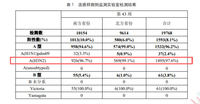 中國疾控中心10月30日發布的監測數據顯示,2025年第43周(10月20日-10月26日)檢測出的流感病毒陽性標本中,甲型H3N2毒株已成為當前主流毒株。
