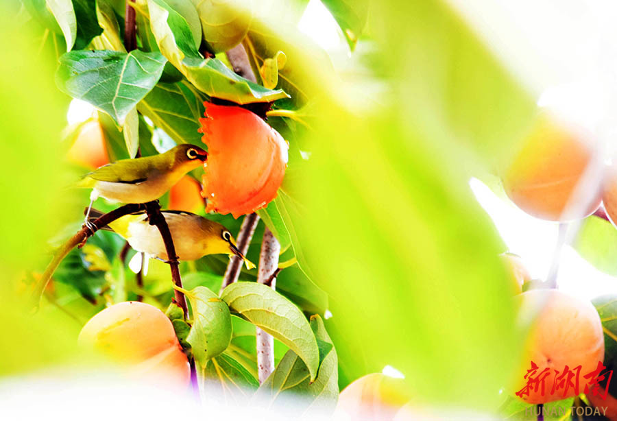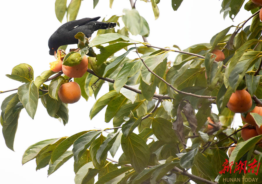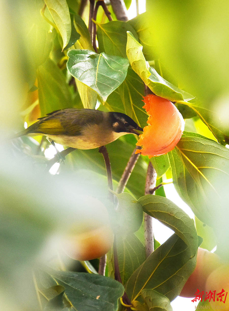 10月31日,澧縣澧澹街道民堰村,一只小鳥在啄食柿子。深秋時節(jié),成熟柿子掛滿枝頭,吸引黃雀等鳥類前來覓食,構(gòu)成一幅生動的生態(tài)畫卷,展現(xiàn)出人與自然和諧共處的美麗鄉(xiāng)村圖景。 柏依樸 攝(湖南圖片庫)