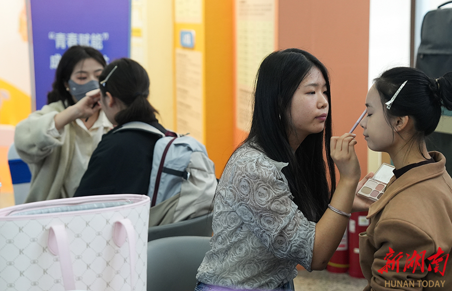 10月31日,工作人員為求職者現場補妝。當天,長沙市離校未就業高校畢業生就業服務暨長沙?福州城市聯合招聘會在長沙市人力資源市場舉行,除聚焦長沙智能制造、數字經濟、文化創意等重點產業外,還特邀福州多家優質企業跨城參與。40余家知名企業現場攬才,共提供980個就業崗位。華聲在線全媒體記者 辜鵬博 通訊員 陳鈺雯 攝影報道