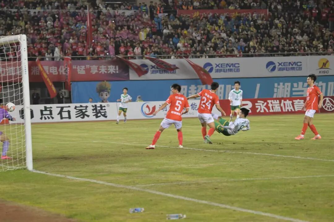 “觸底反彈”的湘潭隊主場迎戰積分榜第七郴州隊。上半場比賽進行到15分鐘,郴州隊8號球員蔣政抓住機會率先破門,郴州隊1:0暫時領先。下半場比賽進行到70分鐘,湘潭隊88號劉杰利用一記精彩的任意球直接得分,將比分扳平,1:1的比分保持到終場結束。