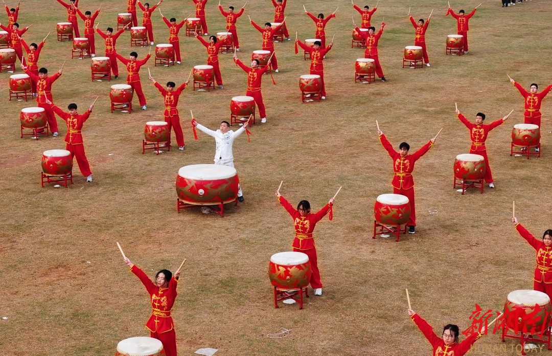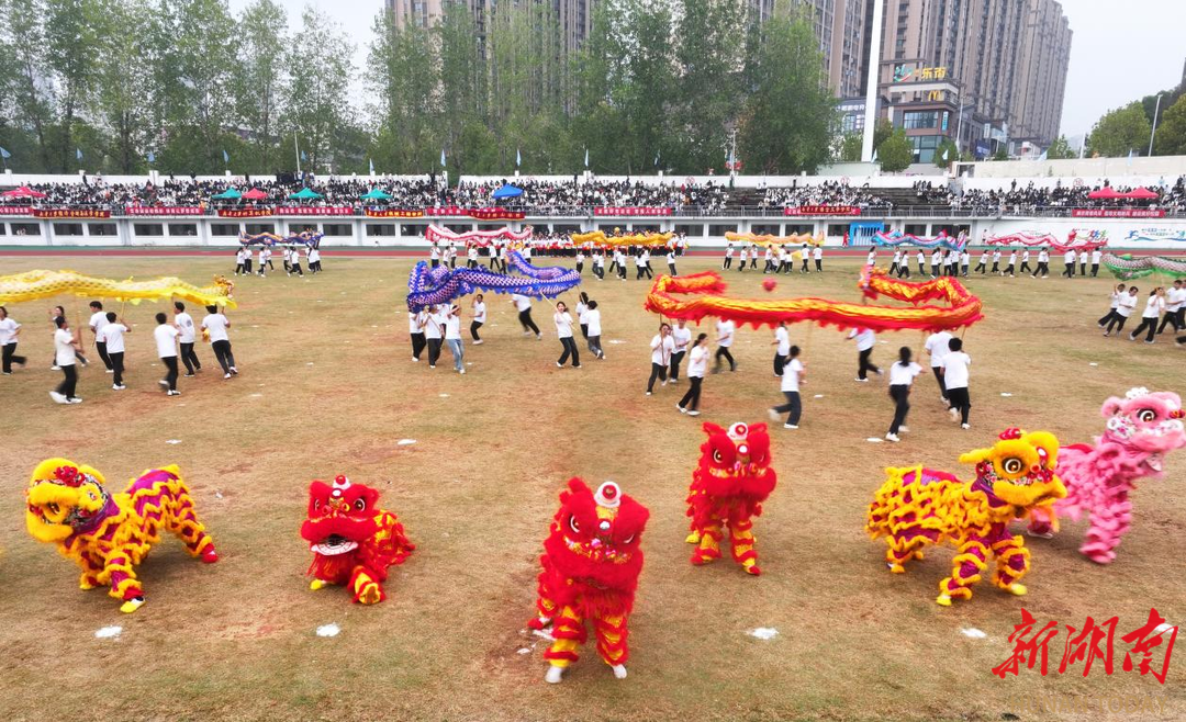 近1000名學(xué)生參與的大型文體節(jié)目“禮贊新時代、奮進(jìn)新征程”精彩上演。表演分為鼓舞青春、龍騰盛世、追夢南華三個部分,整場演出以弘揚(yáng)中華優(yōu)秀傳統(tǒng)文化為根基,深度融合體育、文化、藝術(shù)元素,充分展現(xiàn)了南華師生繼往開來、開拓進(jìn)取的昂揚(yáng)風(fēng)貌。鼓舞青春節(jié)目中,百余名學(xué)生以震撼的鼓點、整齊的動作,將傳統(tǒng)與現(xiàn)代音樂相結(jié)合,帶來一場視聽盛宴。龍騰盛世節(jié)目中,金龍騰躍翻滾、鱗爪飛揚(yáng),雄獅搖頭擺尾、憨態(tài)靈動,將中華傳統(tǒng)民俗的磅礴氣勢與青春活力展現(xiàn)得淋漓盡致。追夢南華節(jié)目環(huán)節(jié),900余名學(xué)子組成的團(tuán)體操方陣變換出“80”字形,紀(jì)念抗戰(zhàn)勝利80周年,彰顯著南華學(xué)子賡續(xù)紅色血脈、勇?lián)鷷r代使命的赤誠。