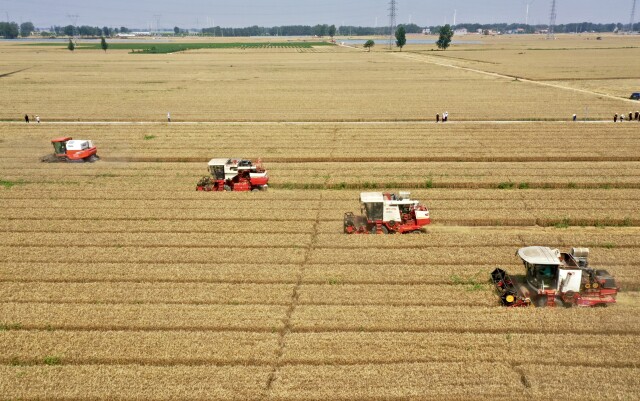 (河南省滑縣萬(wàn)古鎮(zhèn)杜莊村,種糧大戶趁晴好天氣收獲小麥。 河南日?qǐng)?bào)記者王錚攝)