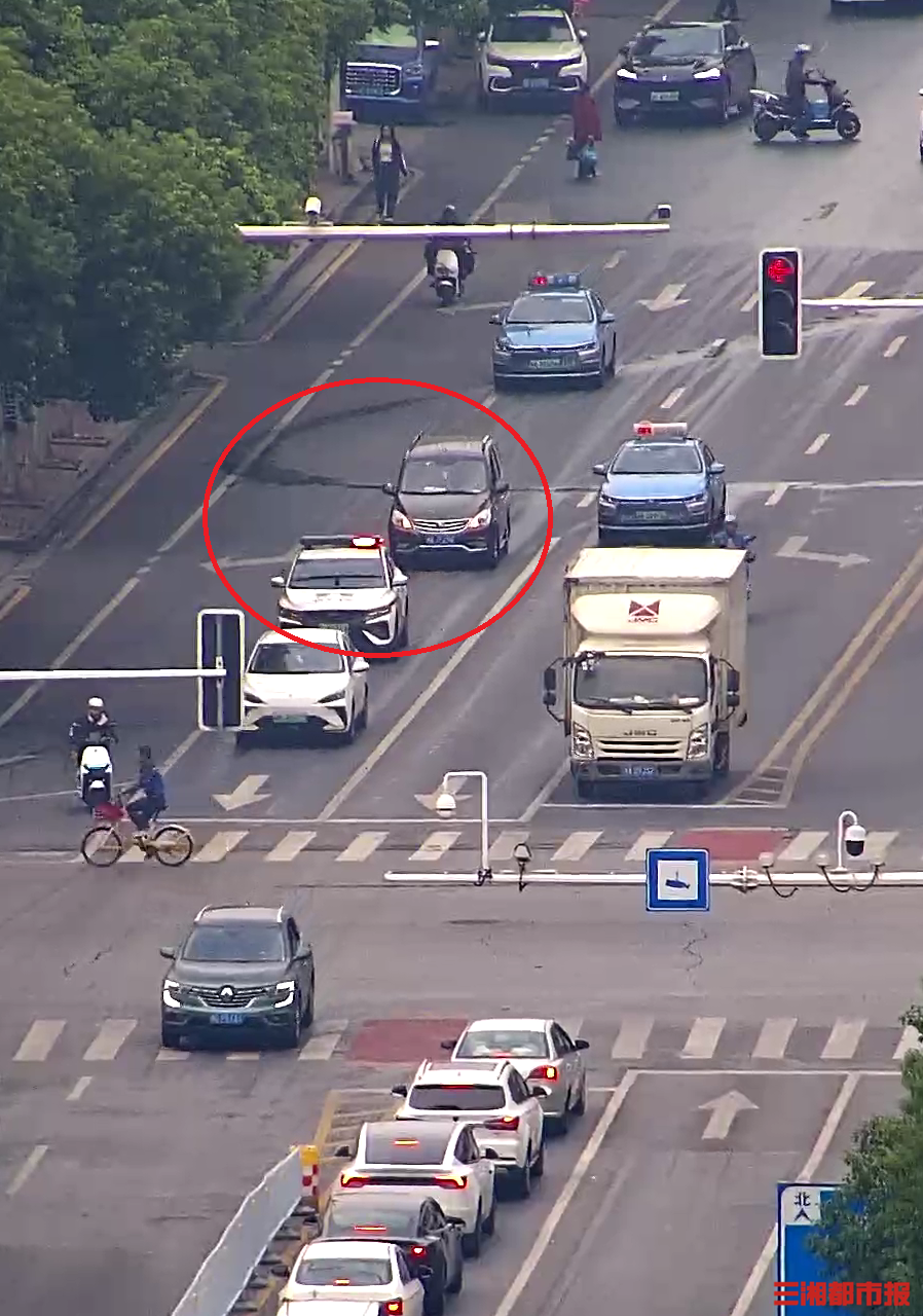 10月26日,長(zhǎng)沙芙蓉交管大隊(duì)警車牽引面包車通過信號(hào)燈。監(jiān)控截圖