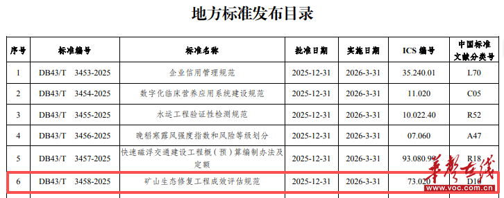 華聲在線1月9日訊(全媒體記者 趙瞳銥 通訊員 趙燾 趙帥軍)記者今日從省自然資源廳獲悉,由該廳牽頭提出、省自然資源事務中心負責編制的《礦山生態修復工程成效評估規范》(以下簡稱《規范》),經省市場監督管理局批準正式發布,擬于2026年3月31日起實施。