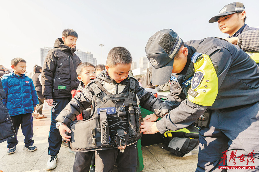 1月10日,吉首市警營開放日暨歲末年初集中宣防活動現場,民警給小朋友講解警用裝備使用知識。