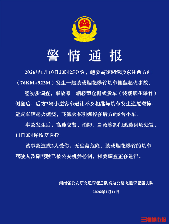 華聲在線1月11日訊(全媒體記者 虢燦)湖南省公安廳交通管理總隊高速公路交通管理四支隊今日發布警情通報,2026年1月10日23時25分許,醴婁高速湘潭段東往西方向(76KM+923M)發生一起裝載煙花爆竹貨車側翻起火事故。